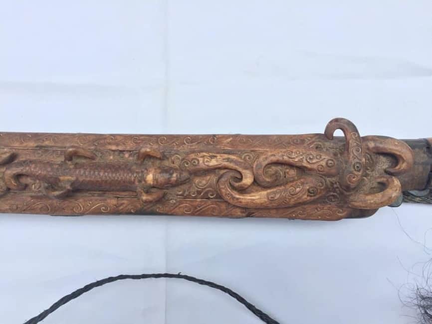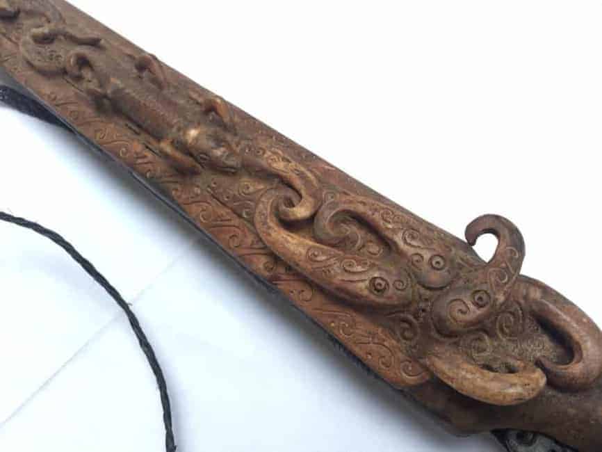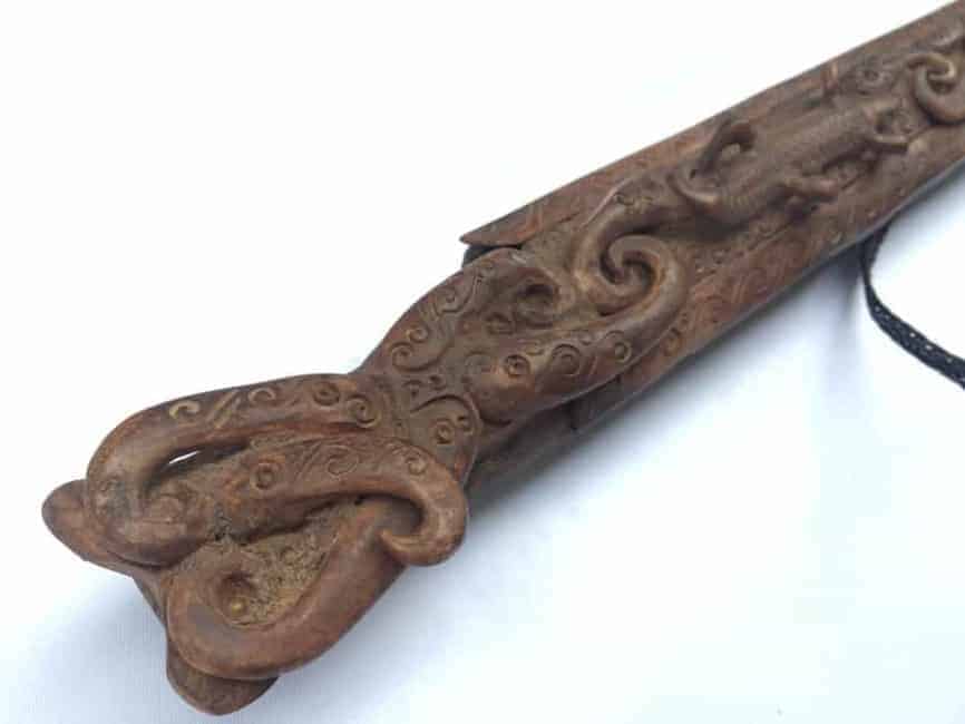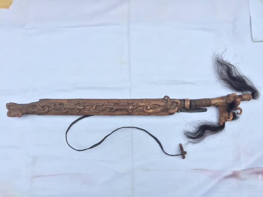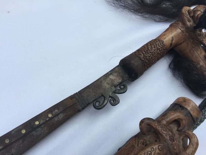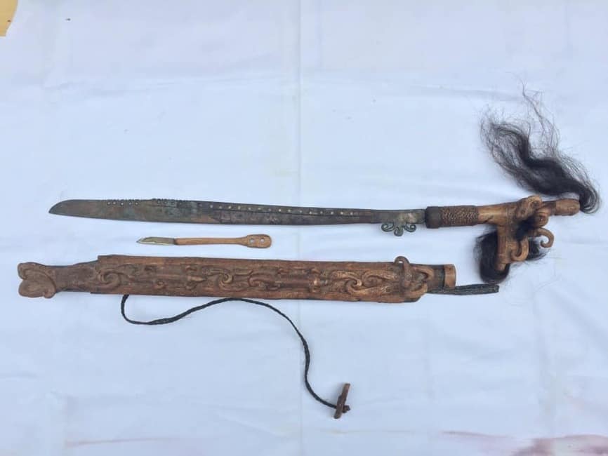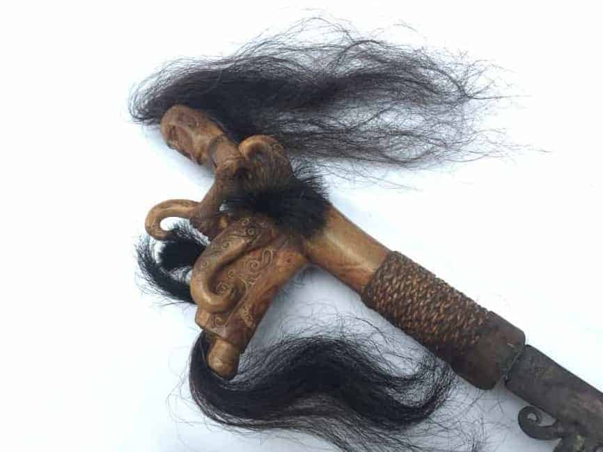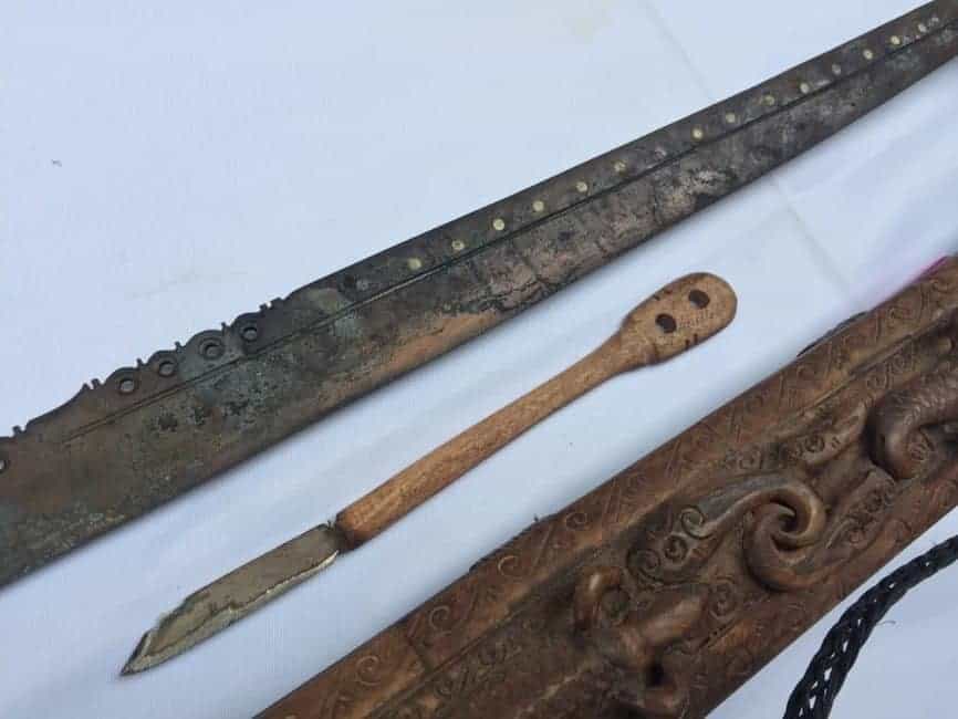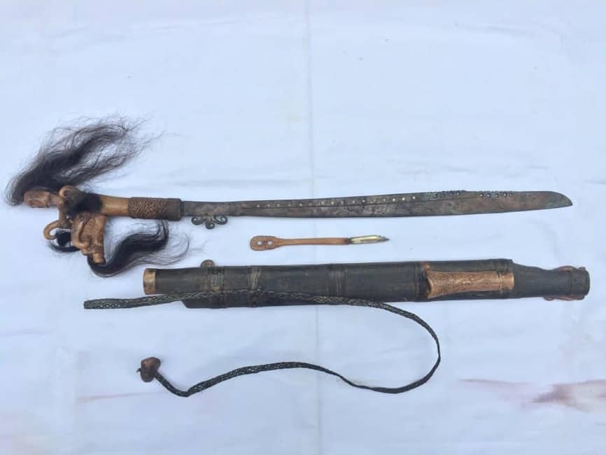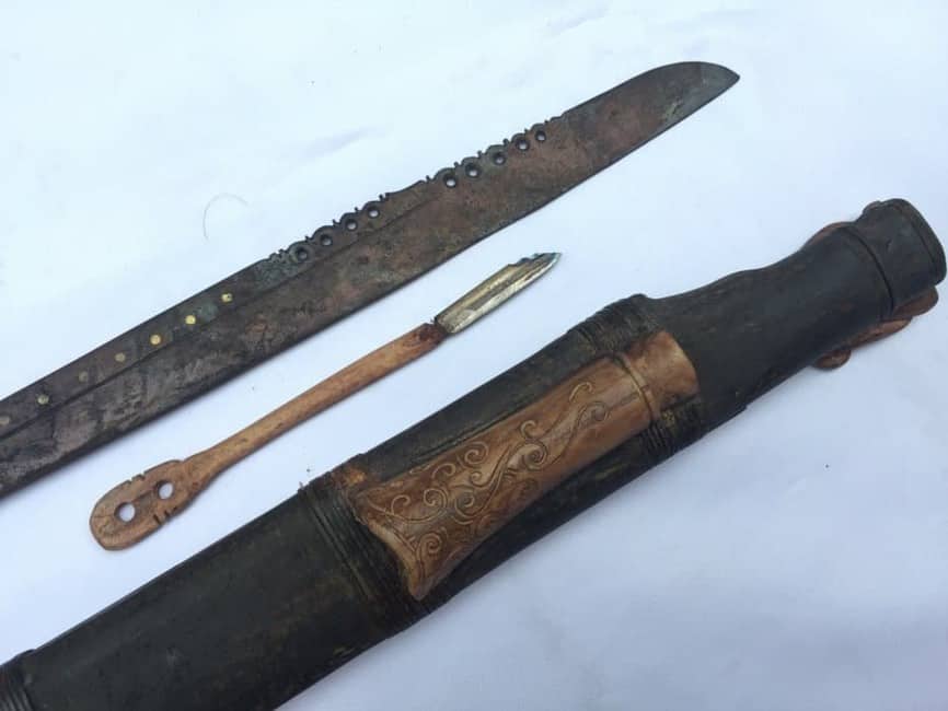 Parang ilang: In Mandau the ilang means double knife and only the Parang Ilang has this characteristic with 2 blades: the main sword and a small knife fitted at the back of the scabbard. A Parang is used primarily as a chopping tool or weapon.